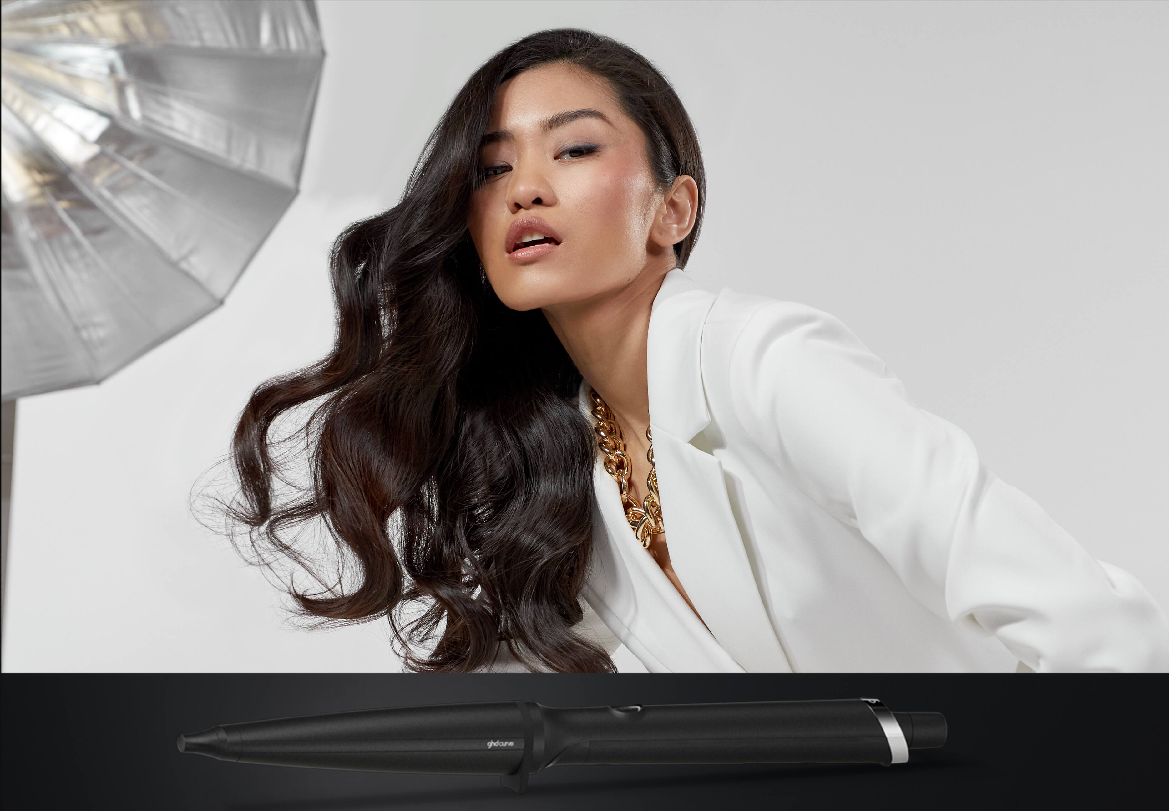 Muotoiluvinkki: Valmistele hiukset ennen kihartamista ghd curl hold spray -suihkeella. Se suojaa hiuksia kihartimen kuumuudelta ja varmistaa lisäksi kiharoiden kestävyyden. Sileä, ylellinen look: kiharra kaikki hiussuortuvat samaan suuntaan. Tuuheampi look: kierrä hiussuortuvat vuorotellen kiharrinosan ala- ja yläpuolelta luodaksesi kiharat, jotka kimpoilevat toisistaan. Käytä ghd-selvityskampaa hiusten pehmittämiseen tai leveää ghd-harjaa kiharoiden silottamiseen.