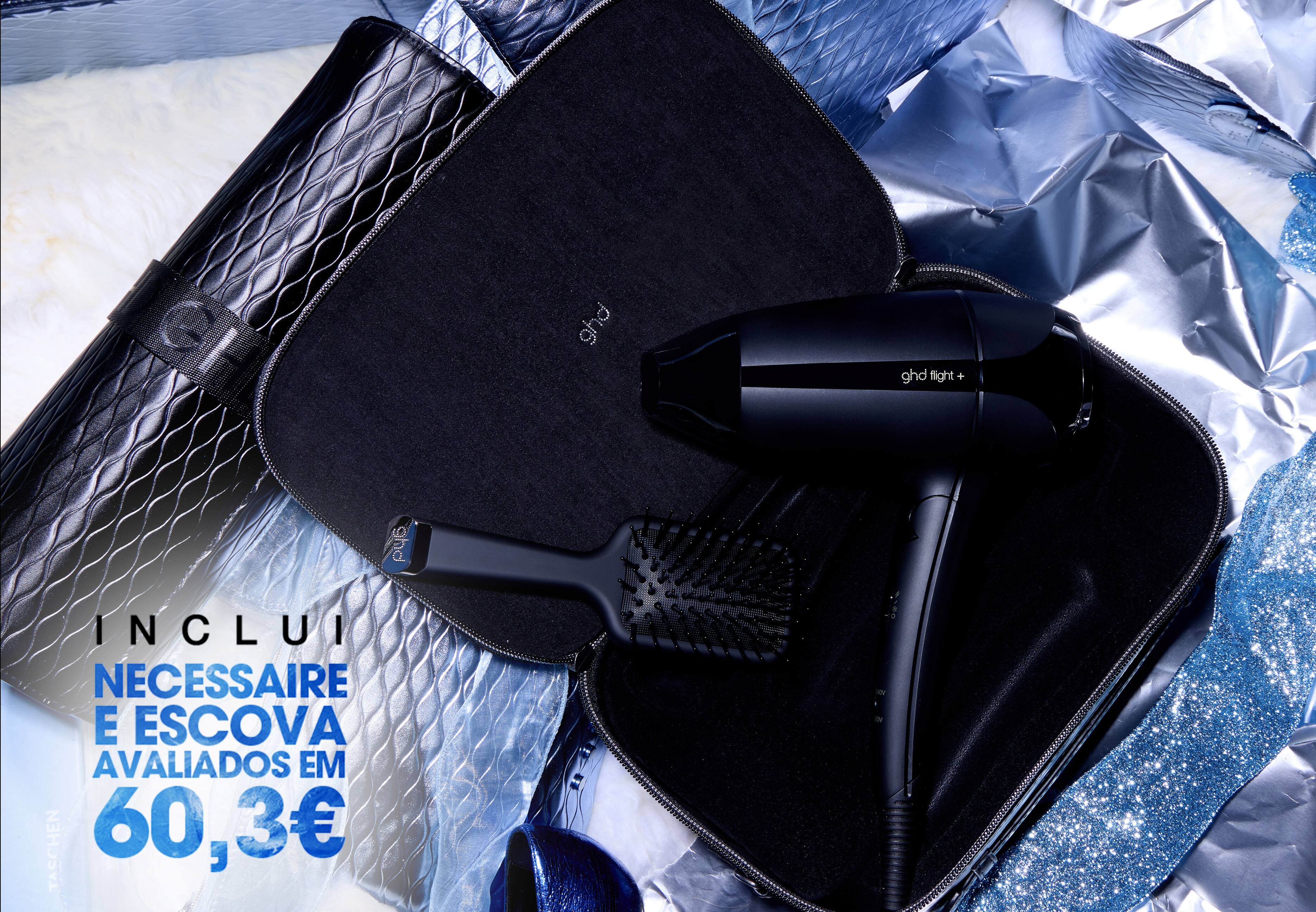 Novo secador de viagem ghd flight+ e um luxuoso estojo de viagem.