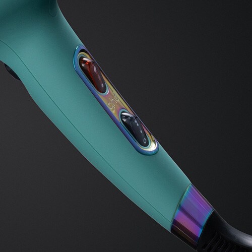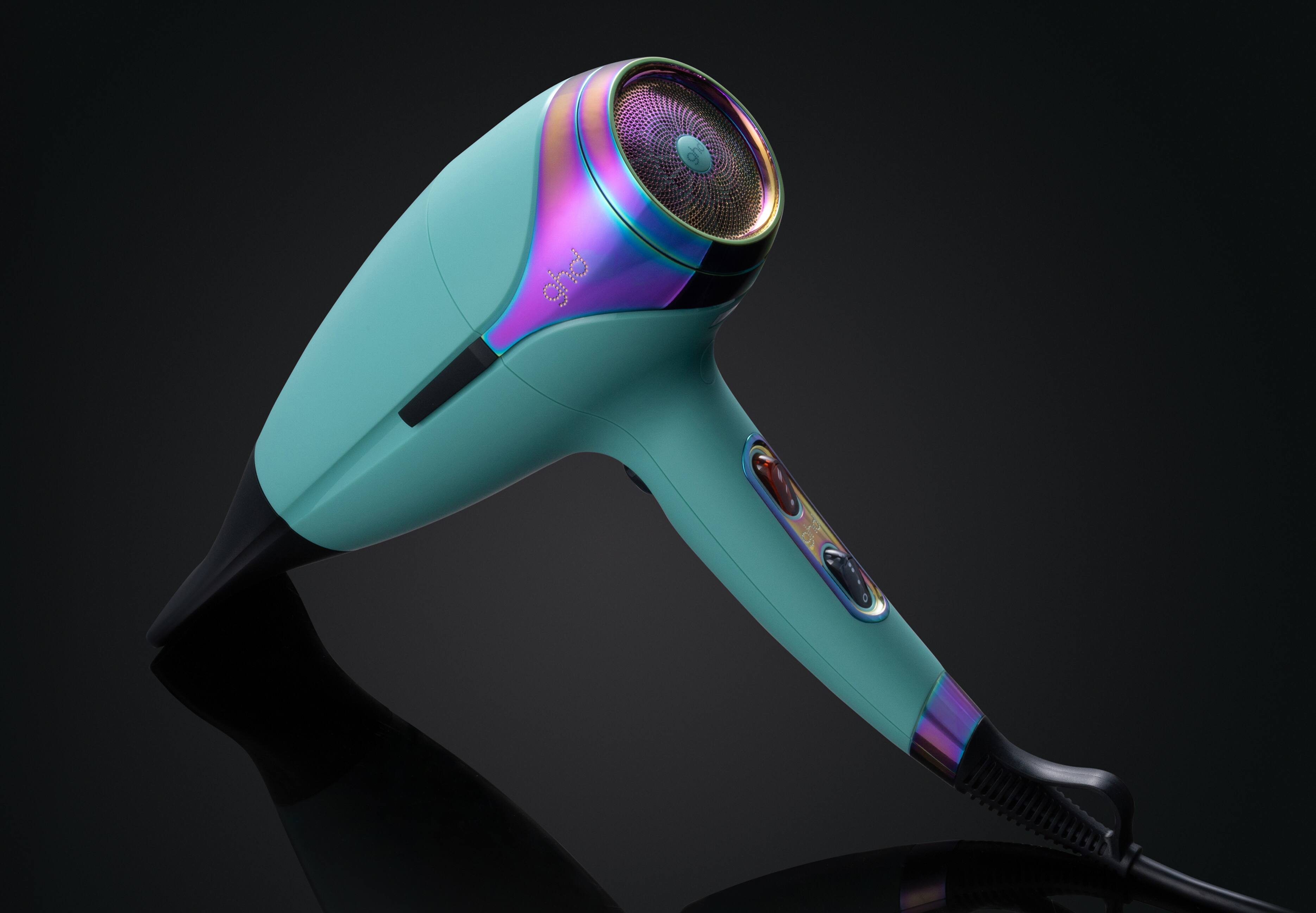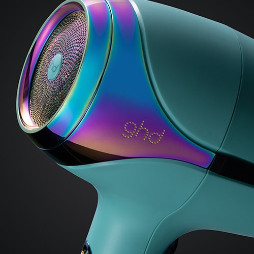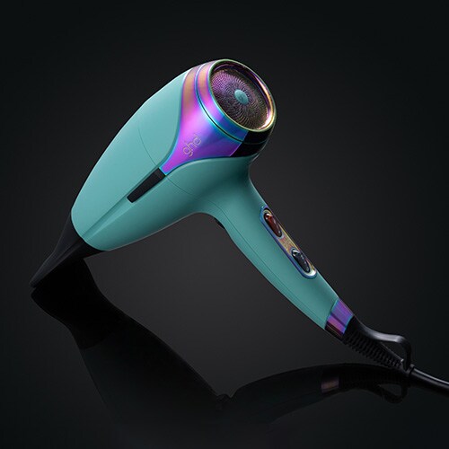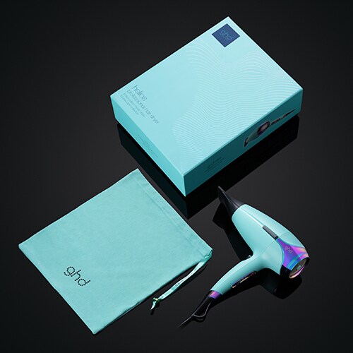 ghd Helios has been wrapped in a cosmic mystic aqua hue with contrasting iridescent accents and is accompanied by a matching dustbag.