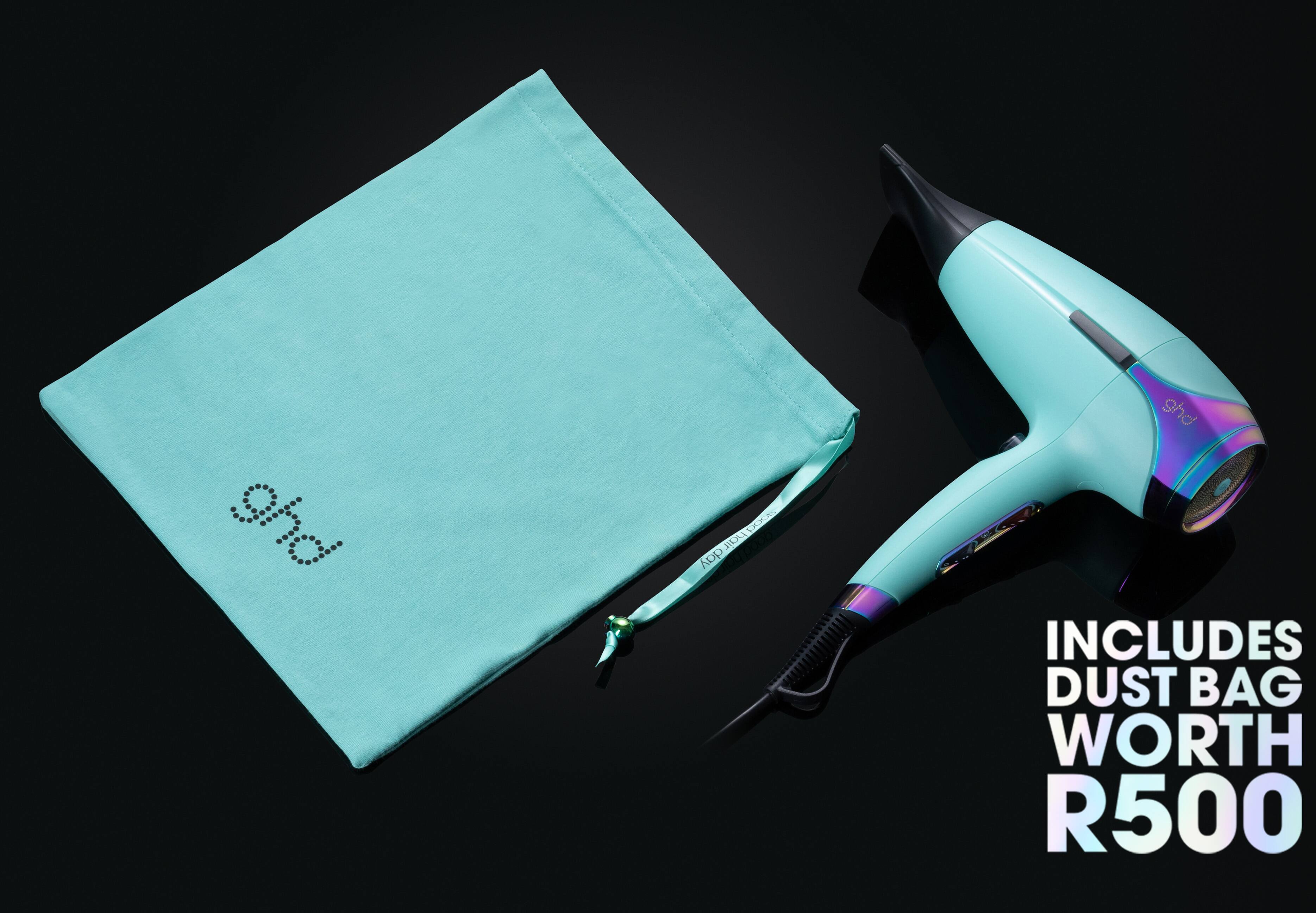 ghd Helios has been wrapped in a cosmic mystic aqua hue with contrasting iridescent accents and is accompanied by a matching dustbag (worth R500).