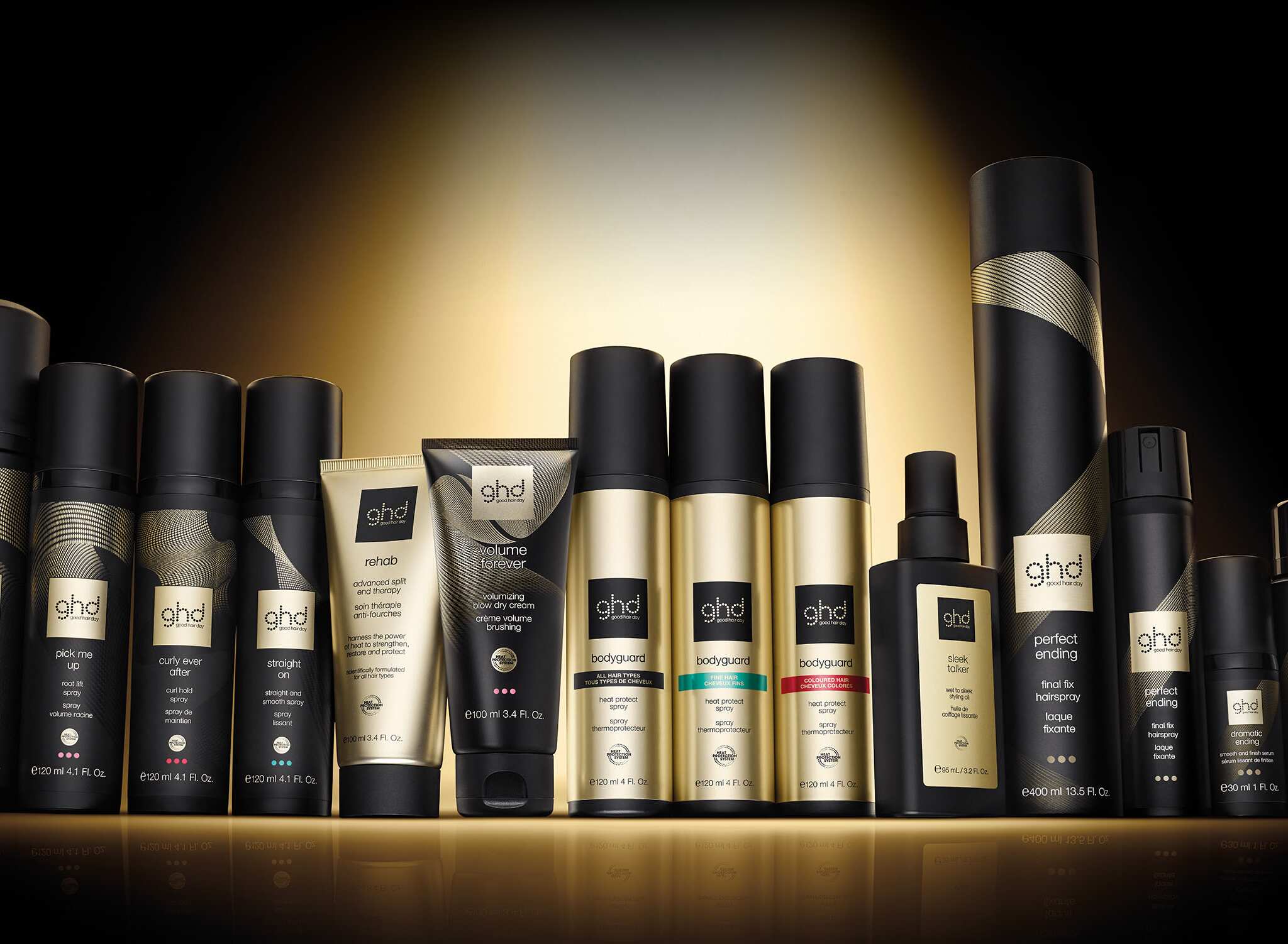 Zaubere voluminöse Blow Dries mit der neuen ghd volume forever Volumencreme, definierte und langhaltende Locken mit dem ghd curly ever after Lockenspray oder ein seidig glattes Finish mit unserem ghd sleek talker Stylingöl.
