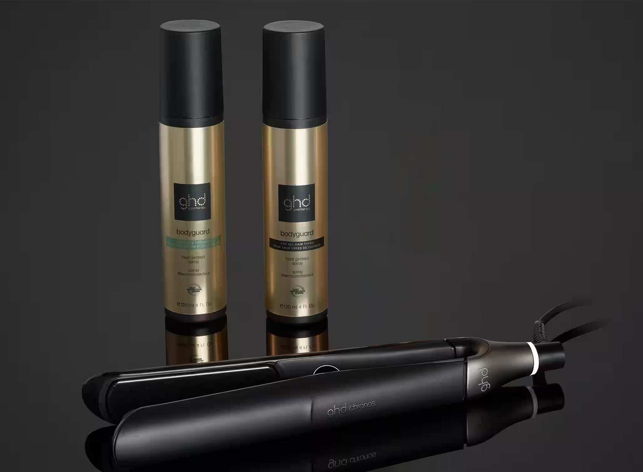 Heat protectant spray acts as an invisible protective barrier between the hair and heat. Heat protectant spray like the ghd bodyguard utilizes a two-fold action of protecting polymers and conditioning agents to protect hair from heat damage up to 230 ̊C, preventing cuticles lifting by improving the smoothness of the hair surface, ensuring sleek and smooth locks every time.