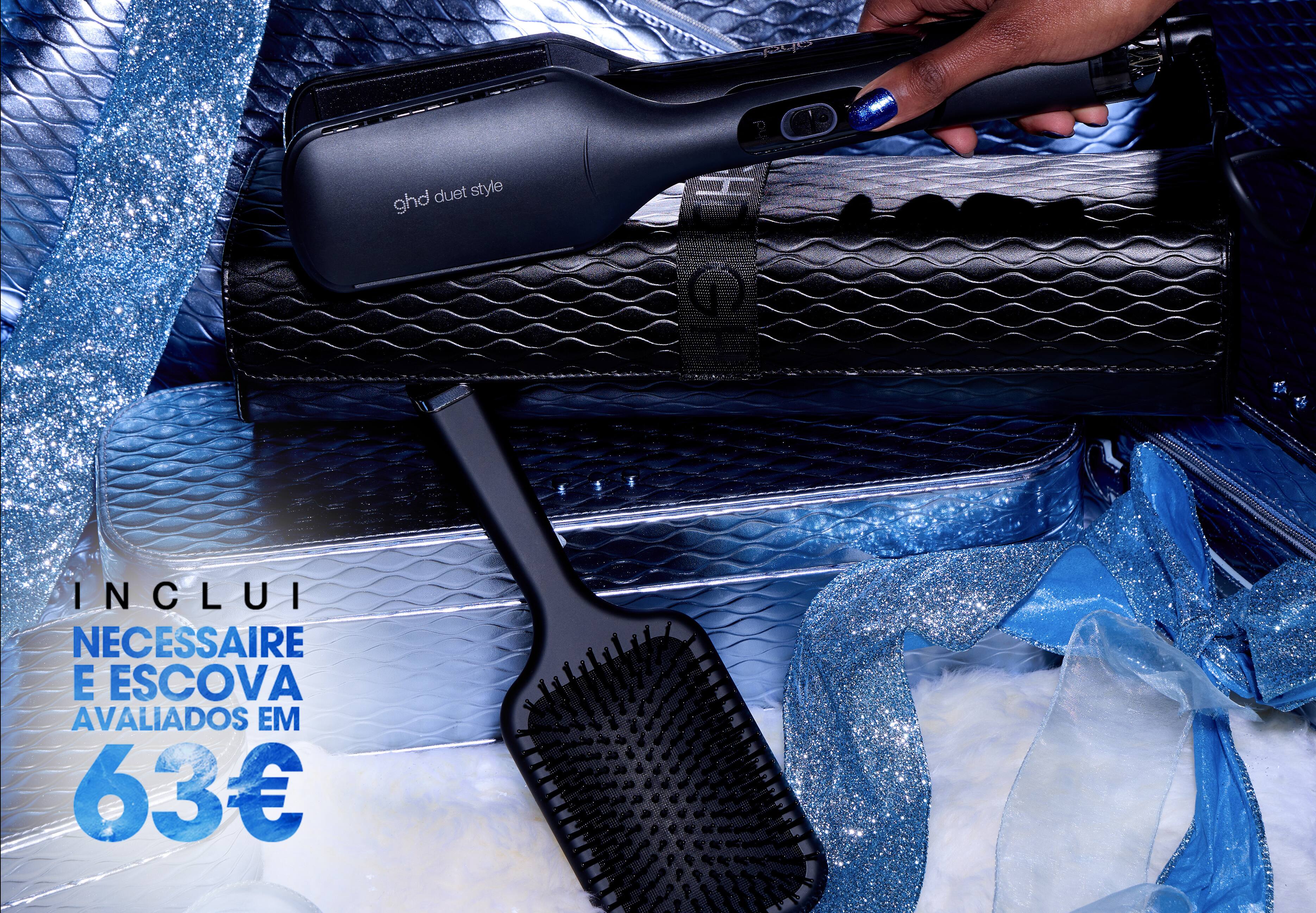 Nesta época festiva, entra num mundo de cabelos luxuosos e penteados impecáveis com o conjunto de oferta ghd duet style™. Imagina desembrulhar a experiência de styling de cabelo definitiva, perfeita para esculpir o teu look de festas com facilidade e elegância. A ghd duet style™ profissional 2-em-1 combina secagem e styling numa única ferramenta revolucionária. Juntamente com a essencial escova all-rounder paddle da ghd e um elegante necessaire resistente ao calor³, é o trio perfeito para conseguires cabelos dignos de salão em casa.